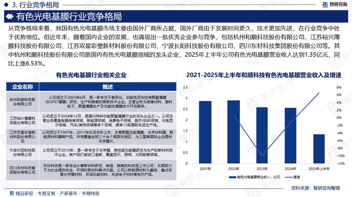 企业格局:从竞争格局来看,我国有色光电基膜市场主要由国外厂商所占据,国外厂商由于发展时间更久,技术更加先进,在行业竞争中处于优势地位。但近年来,随着国内企业的发展,也涌现出一批优秀企业参与竞争,包括杭州和顺科技股份有限公司、江苏裕兴薄膜科技股份有限公司、江苏双星彩塑新材料股份有限公司、宁波长阳科技股份有限公司、四川东材科技集团股份有限公司等。预计未来行业内企业还将继续扩大研发投入,进一步提高市场竞争力,以获取更多的市场份额。