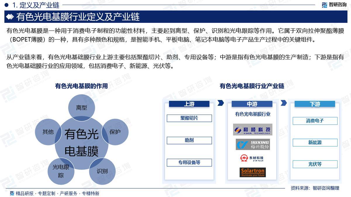 产业链:从产业链来看,有色光电基础膜行业上游原材料包括PET、有色母粒、助剂等;中游是指有色光电基膜的生产制造;下游是指有色光电基础膜行业的应用领域,包括消费电子、新能源、光伏等。
